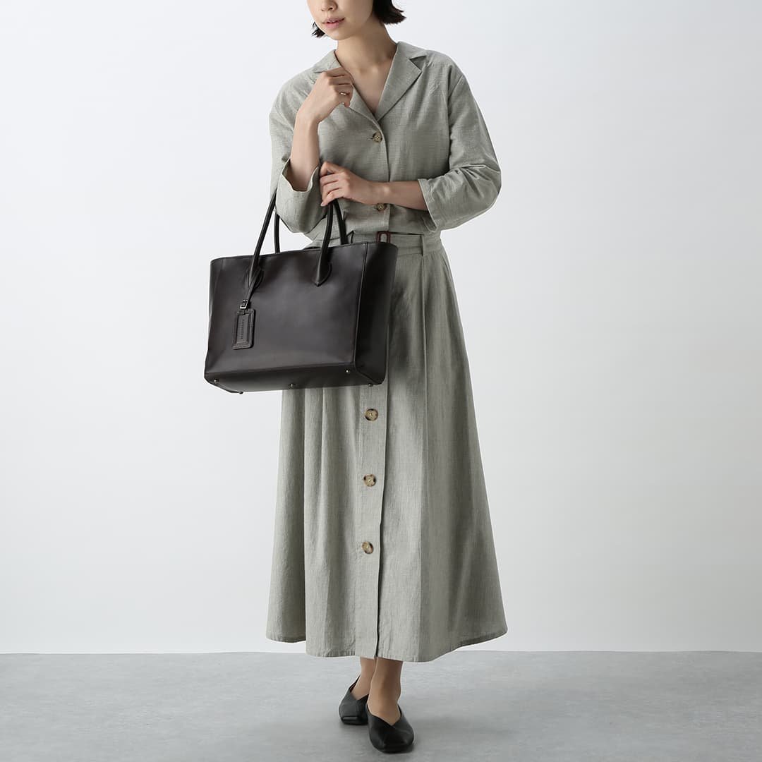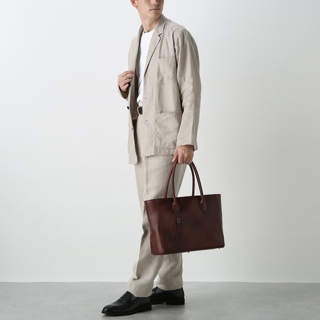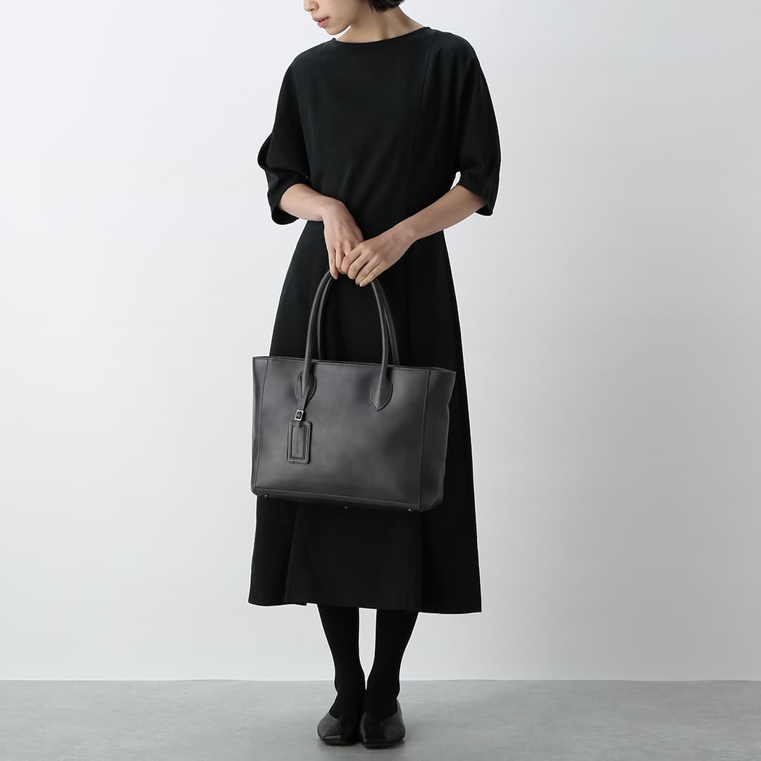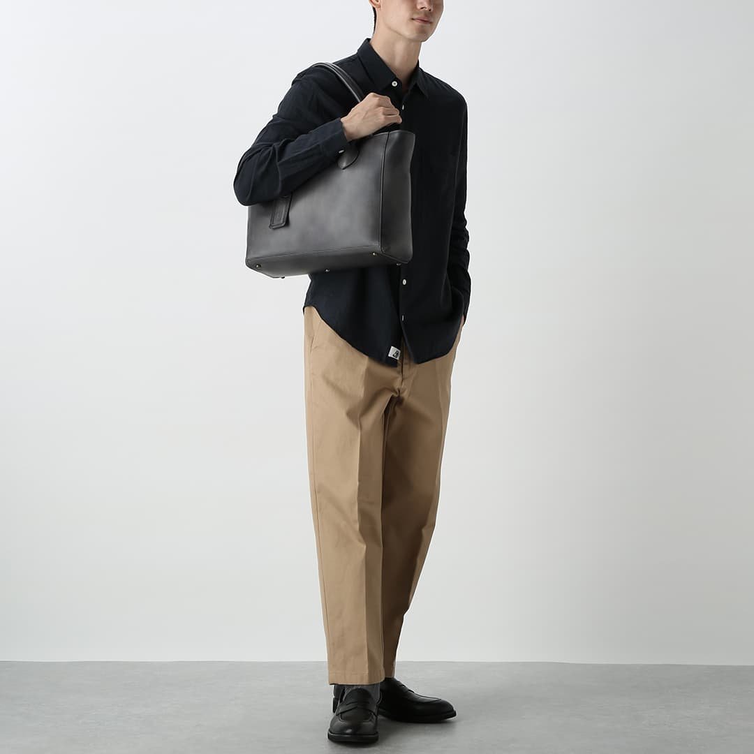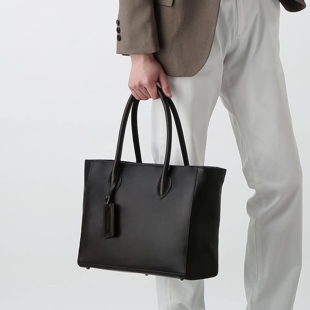 This box-shaped tote bag is made from expressive antique leather. It is compact enough to fit neatly when you carry it. but has a sturdy gusset to keep the storage capacity. It can hold A4 size documents and a 13-inch PC.