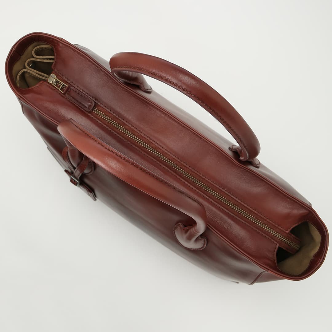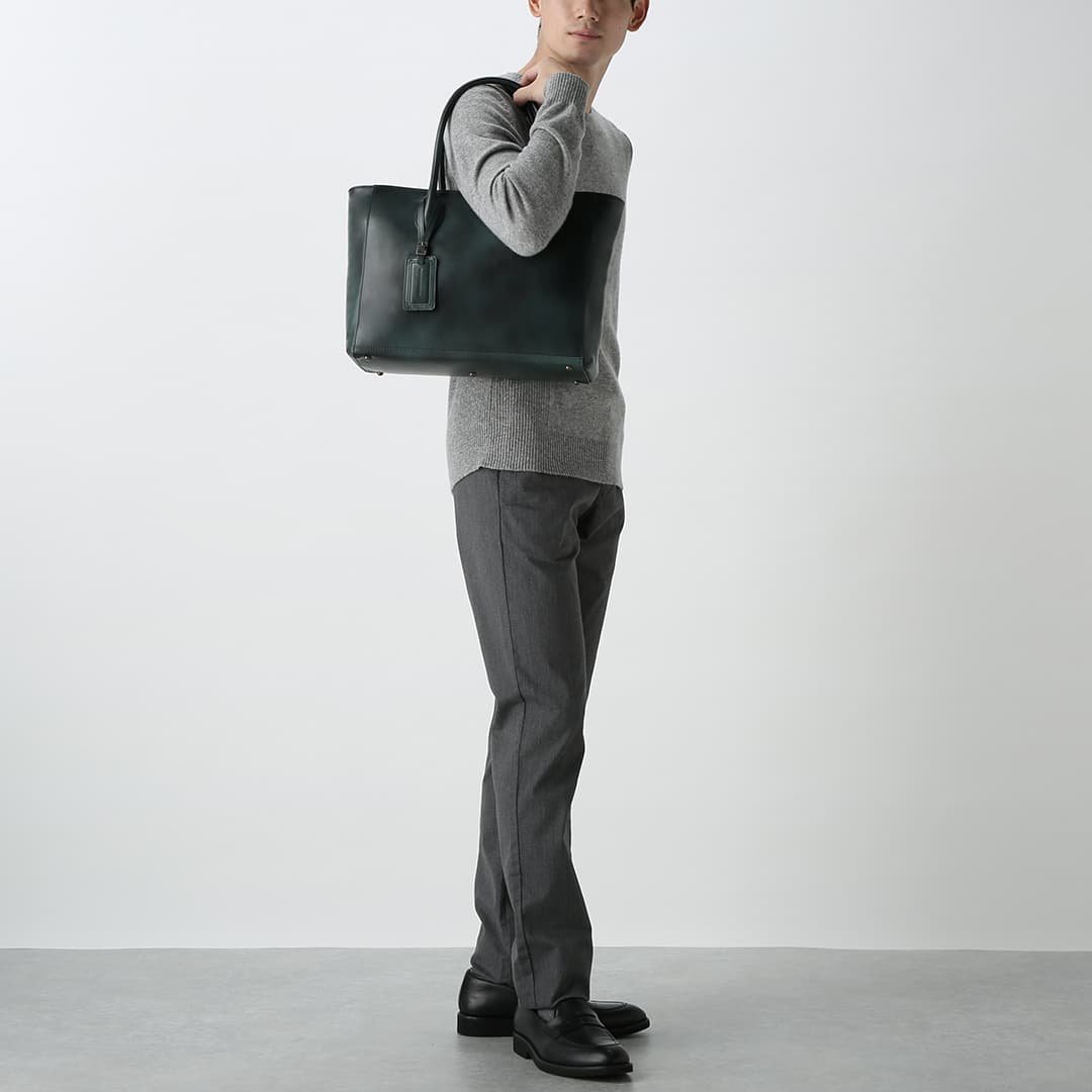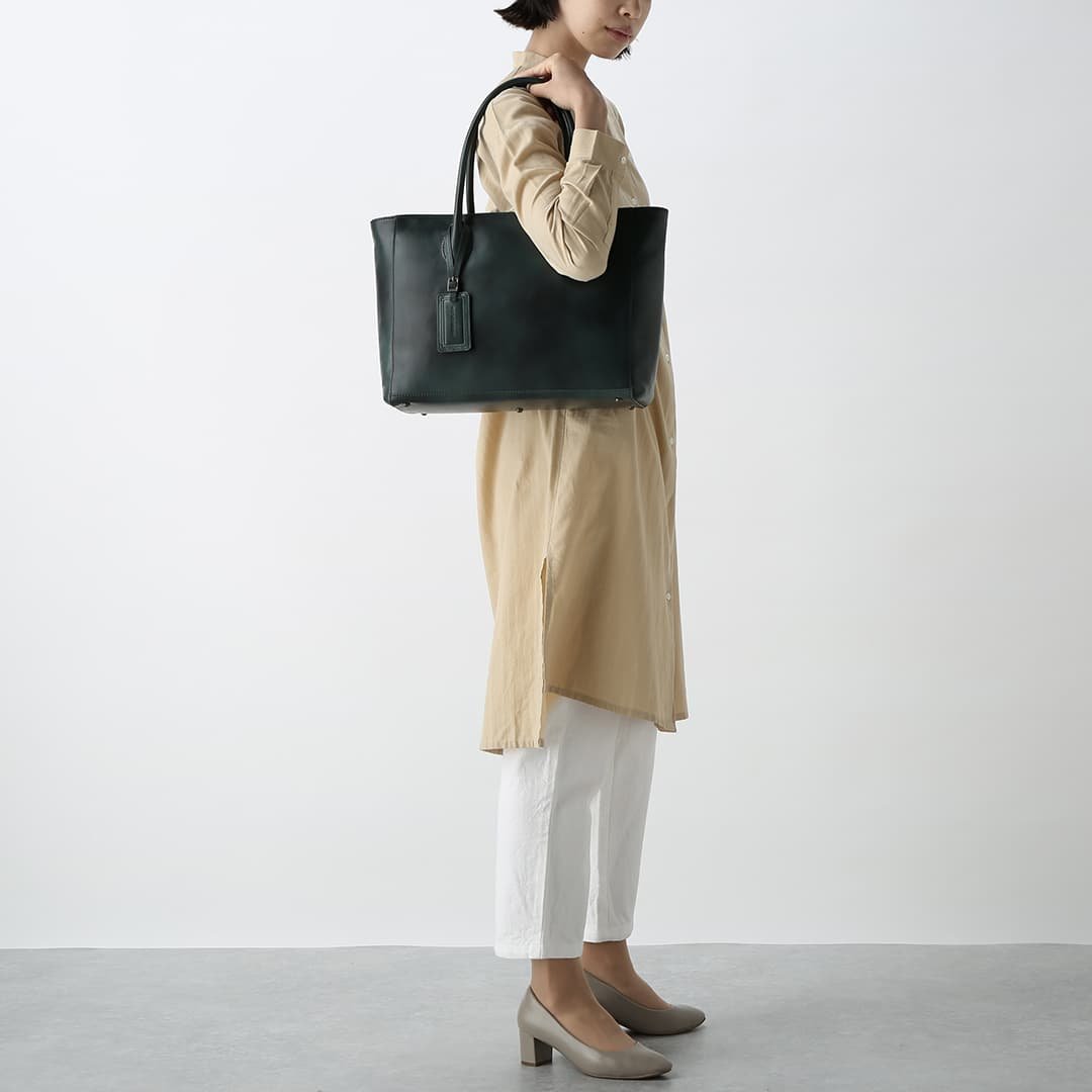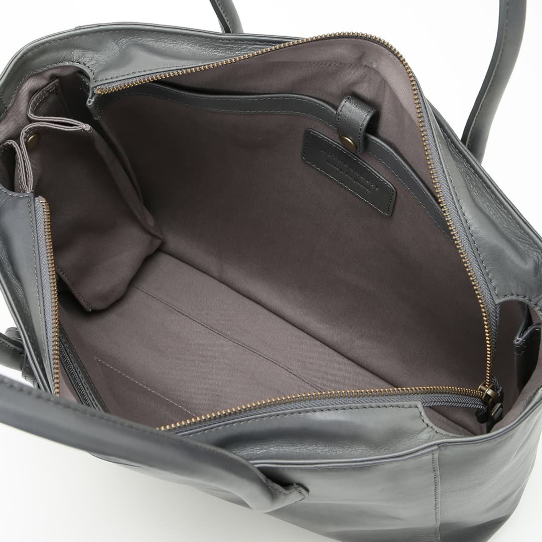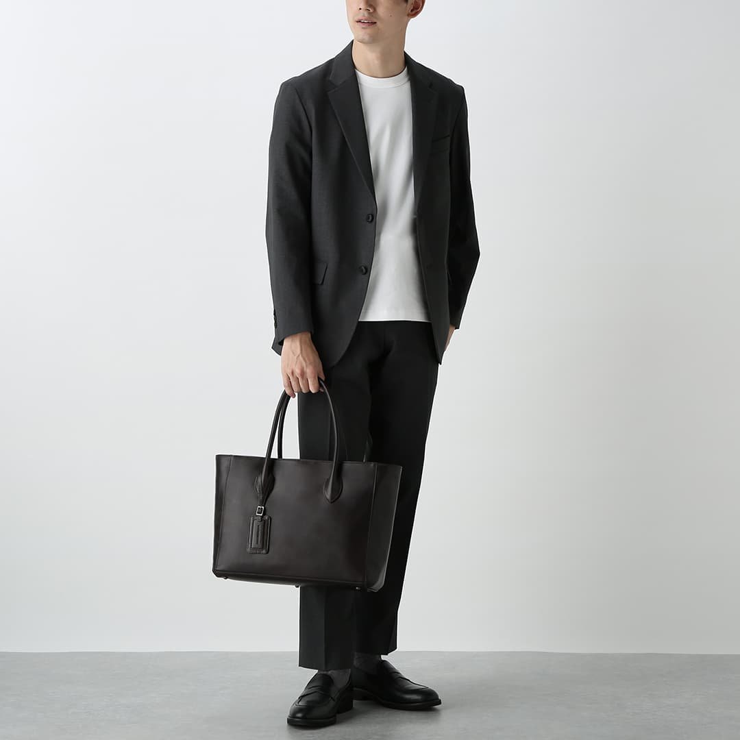 This box-shaped tote bag is made from expressive antique leather. It is compact enough to fit neatly when you carry it. but has a sturdy gusset to keep the storage capacity. It can hold A4 size documents and a 13-inch PC.