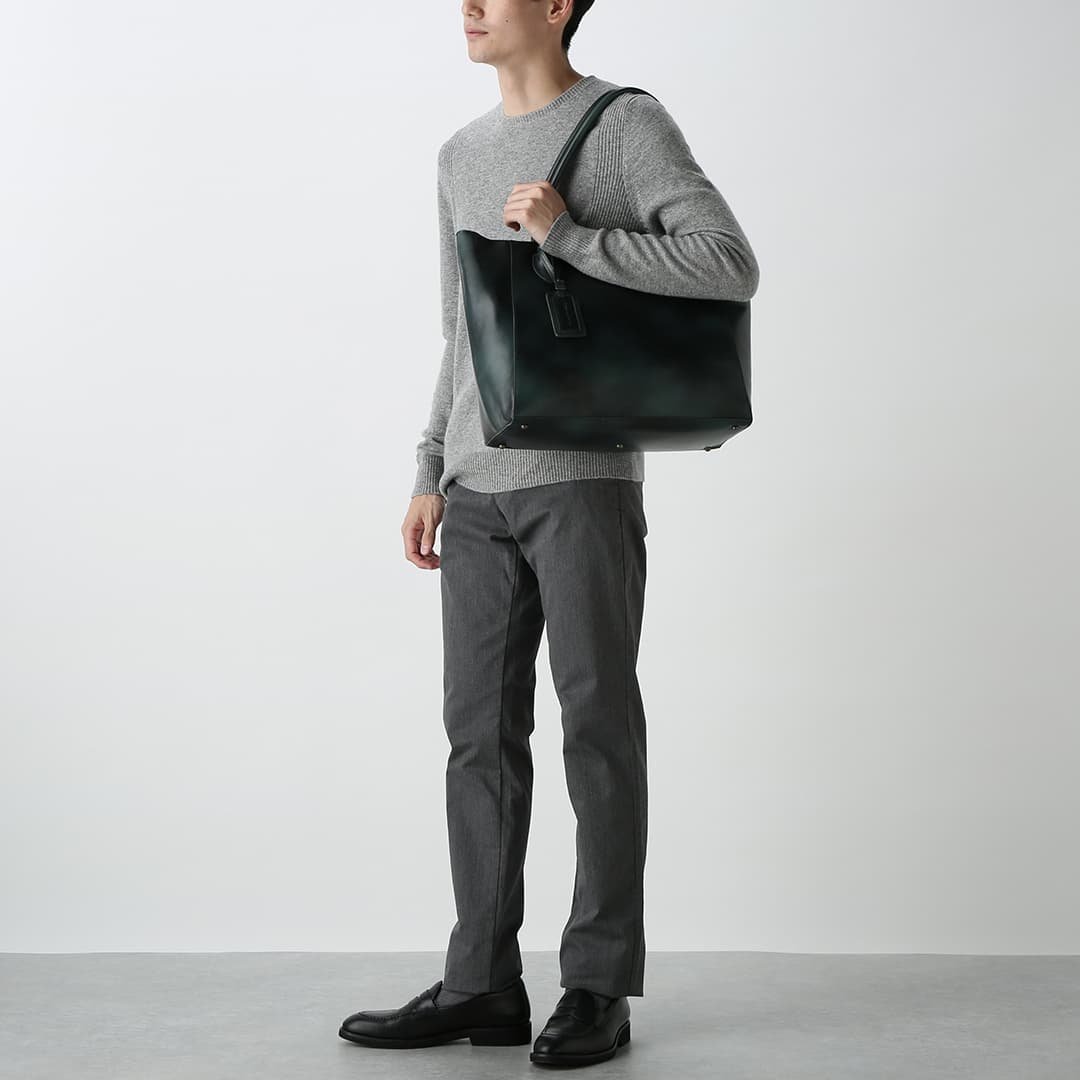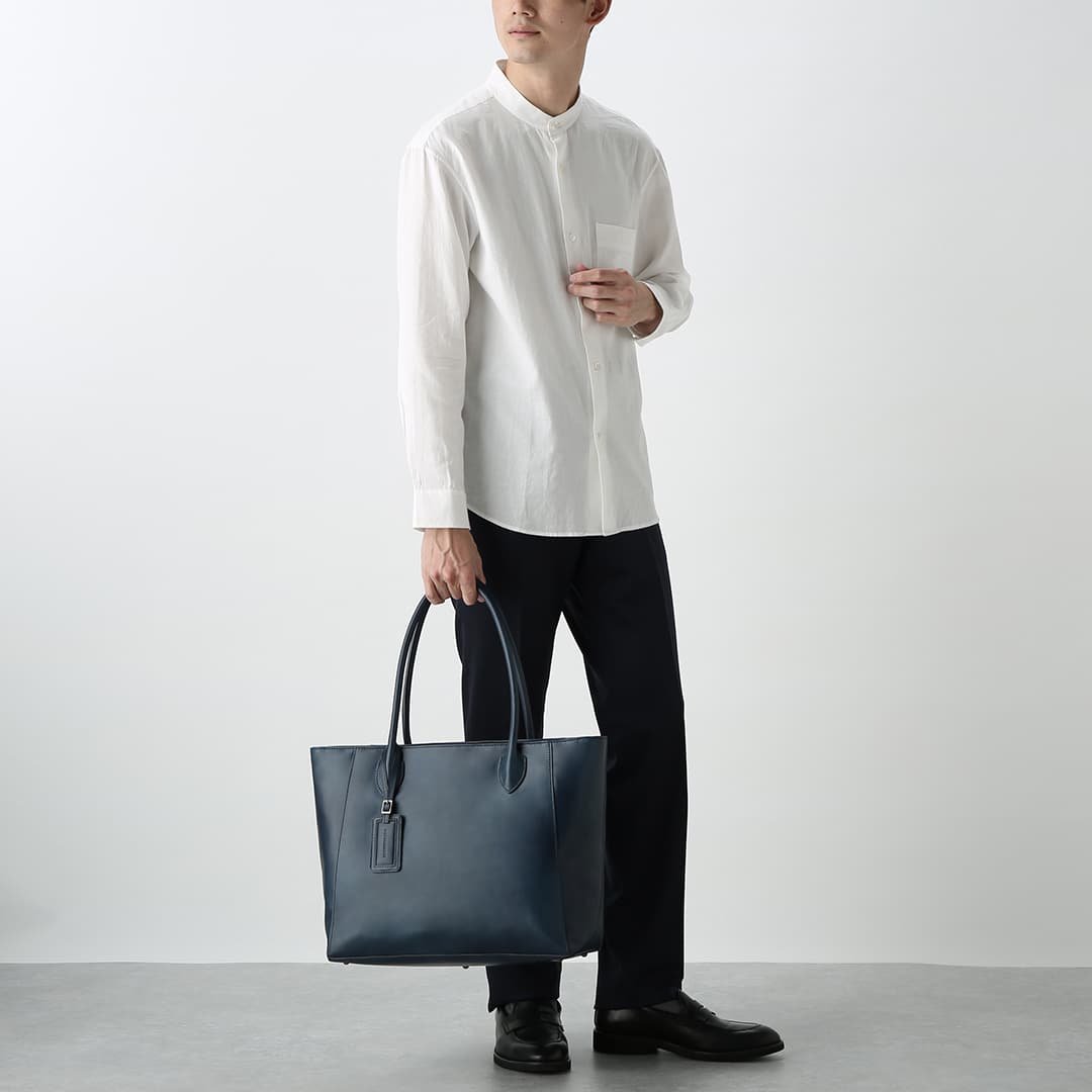 A large-capacity tote bag for commuting made from expressive antique leather. The size makes it a great companion for a one-night business trip or trip. and the antique shading enhances the design. making it useful for a wide range of occasions. The bag itself can hold up to a 15-inch PC.